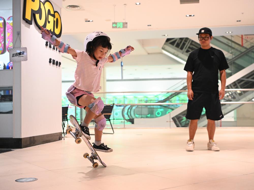 7月17日,閤伟峰正在看女儿閤灵暄(左)练习滑板。新华社记者 王曦 摄