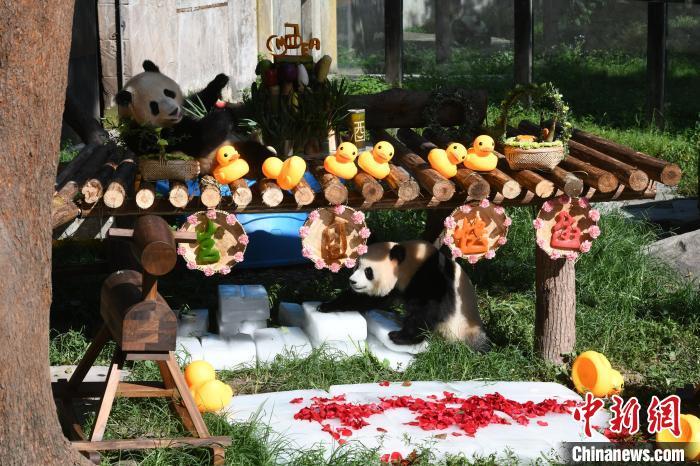 7月22日,重庆动物园为大熊猫双胞胎兄妹“渝可”“渝爱”举办2周岁生日会。中新社记者 周毅 摄