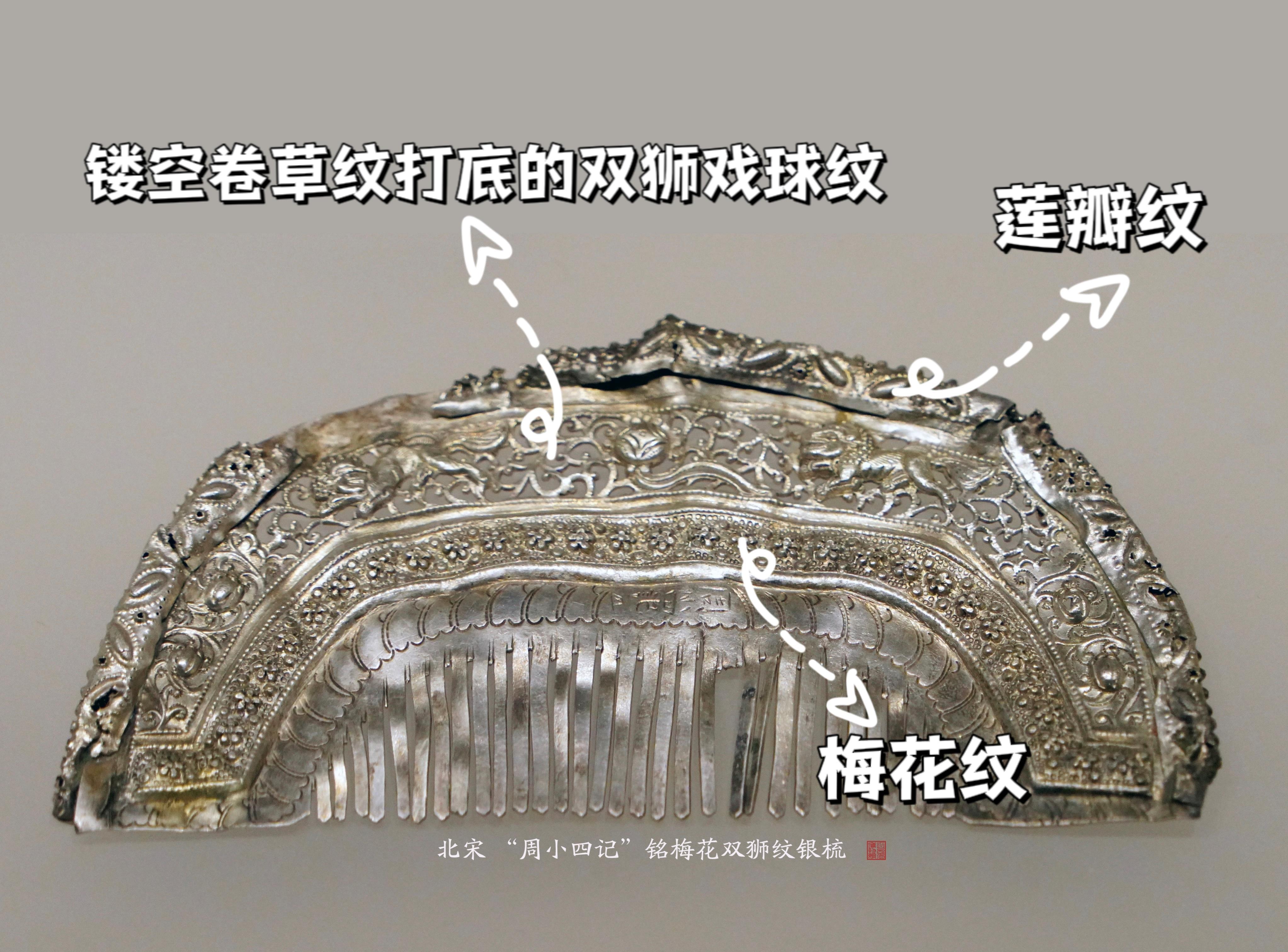 “周小四记”铭梅花双狮纹银梳