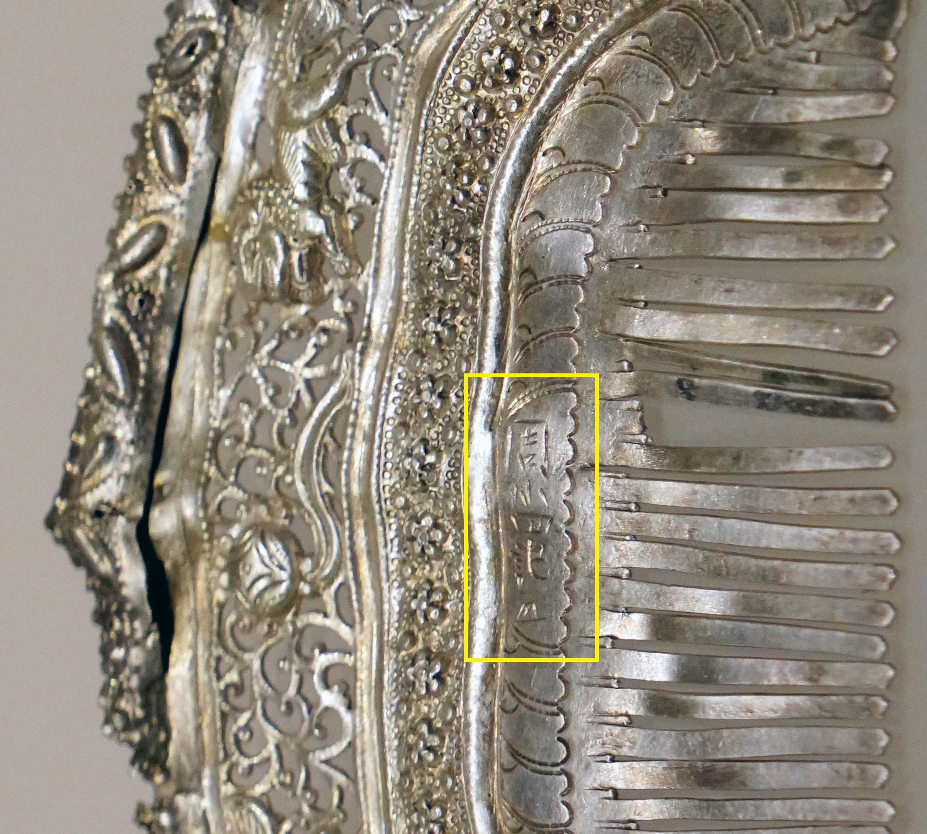 用金银成色的印记刻在梳子上