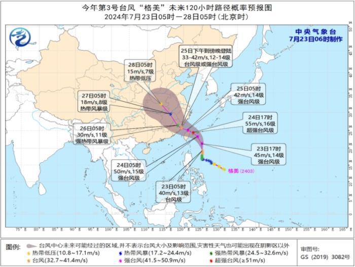 预计,“格美”将以每小时20公里左右的速度向偏北转西北方向移动,强度继续加强,最强可达强台风级或超强台风级(50-58米/秒,15-17级),逐渐向台湾岛东部沿海靠近,并将于24日晚上在台湾岛中北部沿海登陆(强台风级,14-15级,42-48米/秒)。之后穿过台湾岛,将于25日下午到傍晚在福建中部到浙江南部一带沿海登陆(台风级或强台风级,12-14级,33-42米/秒)。
