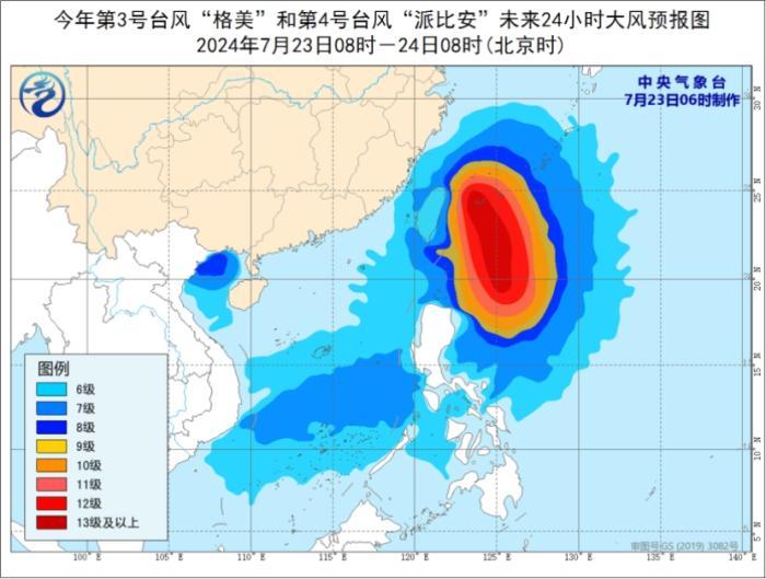 大风预报:7月23日08时至24日08时,东海南部及钓鱼岛附近海域、台湾海峡、台湾以东洋面、巴士海峡、南海中南部及南沙群岛附近海域、北部湾西北部海域以及广西西南部沿海、台湾岛东部和北部沿海将有6-7级大风,其中台湾以东洋面的风力有8-10级,部分海域风力可达11-13级,“格美”中心经过的附近海面的风力有14-15级,阵风16-17级。