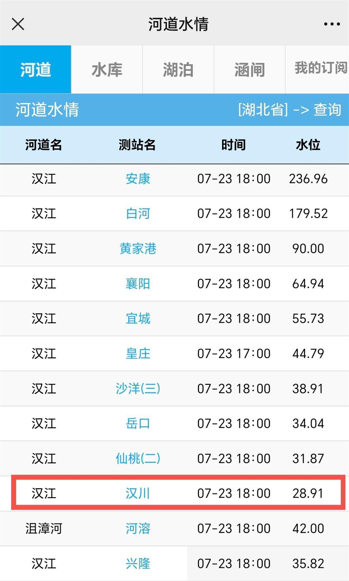 汉江上各站水位均在设防以下,汉川站于23日退出警戒水位。极目新闻记者7月23日18时查询发现,汉川站水位28.91米,低于警戒水位。