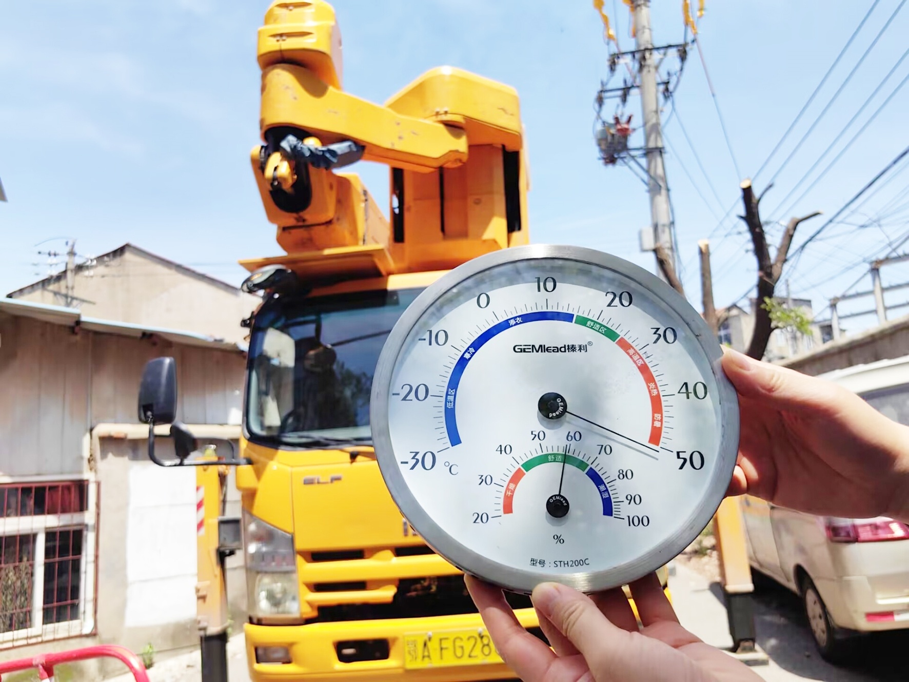此时,两位作业人员完全暴露在烈日之下。车斗下方,靠着电线杆架放置的温度计显示,当时气温为已经超过50℃的最高数值,堪称“高温爆表”,而记者早就汗如雨下。