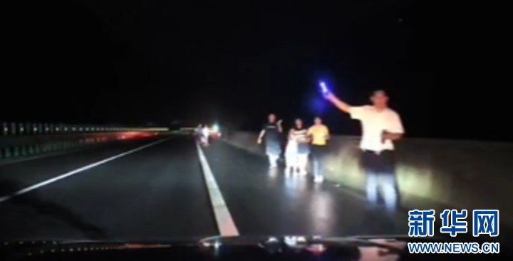夏辉(右一)挥动强光手电拦停车辆。(车辆行车记录仪视频截图)