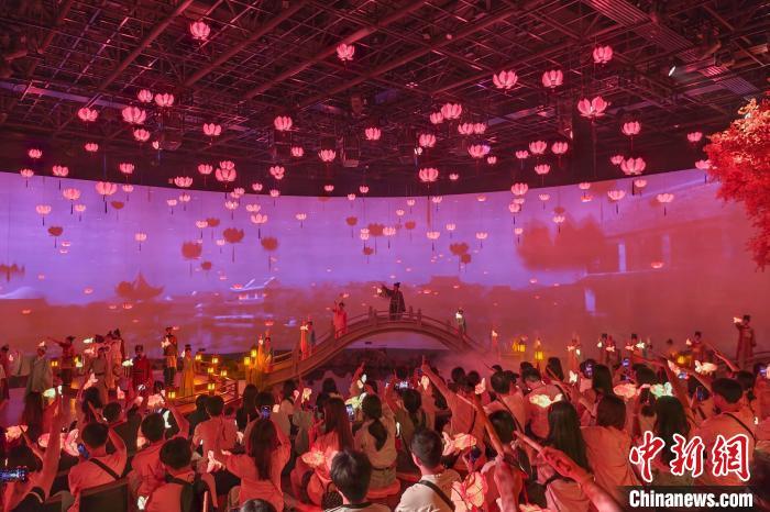 21日晚,在昆山周庄,台湾青年手执鱼灯,沉浸式体验多维空间剧《只此周庄》。中新网记者 泱波 摄