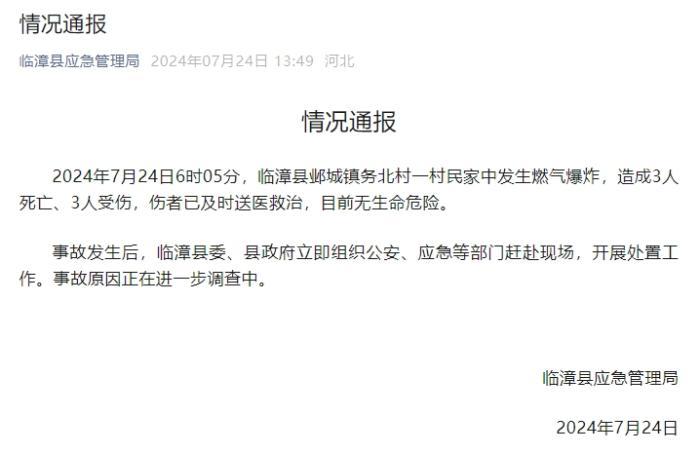 中新网7月24日电 据“临漳县应急管理局”微信公众号消息,河北省临漳县应急管理局发布通报称,2024年7月24日6时05分,临漳县邺城镇务北村一村民家中发生燃气爆炸,造成3人死亡、3人受伤,伤者已及时送医救治,目前无生命危险。