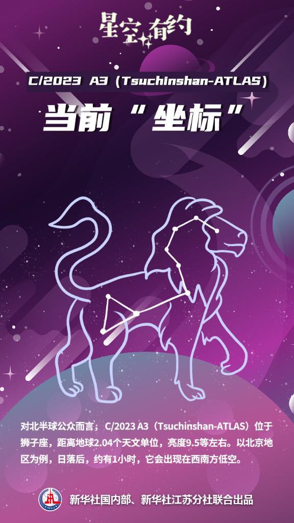 中国科学院紫金山天文台科普主管王科超介绍,对北半球公众而言,当前C/2023 A3(Tsuchinshan-ATLAS)位于狮子座,距离地球有2.04个天文单位,亮度在9.5等左右。以北京地区为例,日落后,约有1小时,它会出现在西南方低空,感兴趣的公众可借助天文望远镜观测到它,或是借助相机长时间曝光来尝试拍摄。大约21时,它会落到地平线以下。