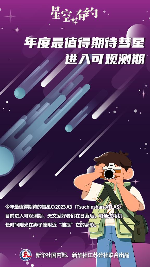 C/2023 A3(Tsuchinshan-ATLAS)于2023年被发现,是中国科学院紫金山天文台发现的第8颗彗星,中文名为紫金山-阿特拉斯彗星。“它是一颗逆行轨道彗星,其轨道平面和黄道面的夹角约49度。”紫金山天文台研究员赵海斌说,当前,这颗彗星正朝着近日点方向运动,预计将于北京时间9月28日凌晨通过近日点,届时与太阳的距离是0.39个天文单位,在10月12日最接近地球,距离地球约0.47个天文单位。