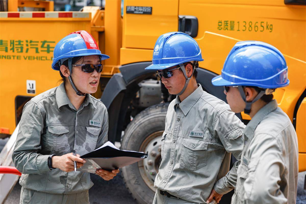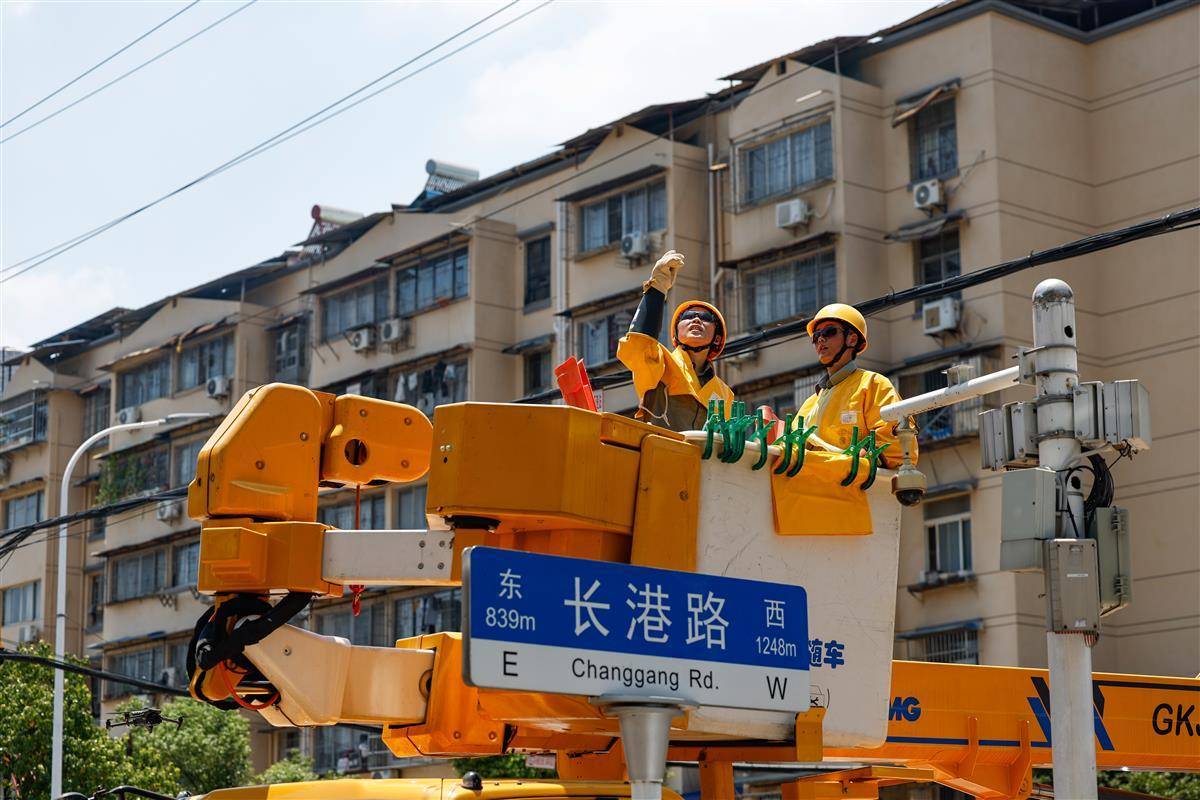 在武汉市江岸区金桥大道10千伏德塔线作业现场,国网武汉供电公司配网不停电作业中心女子带电作业班成员正操作带电机器人,利用机械手为三根导线安装验电接地环,随后又赶往江汉区长港路10千伏富强线,及时处理杆塔上一处发热线夹接点,确保为周边1000多户居民在高温期间不间断供电。