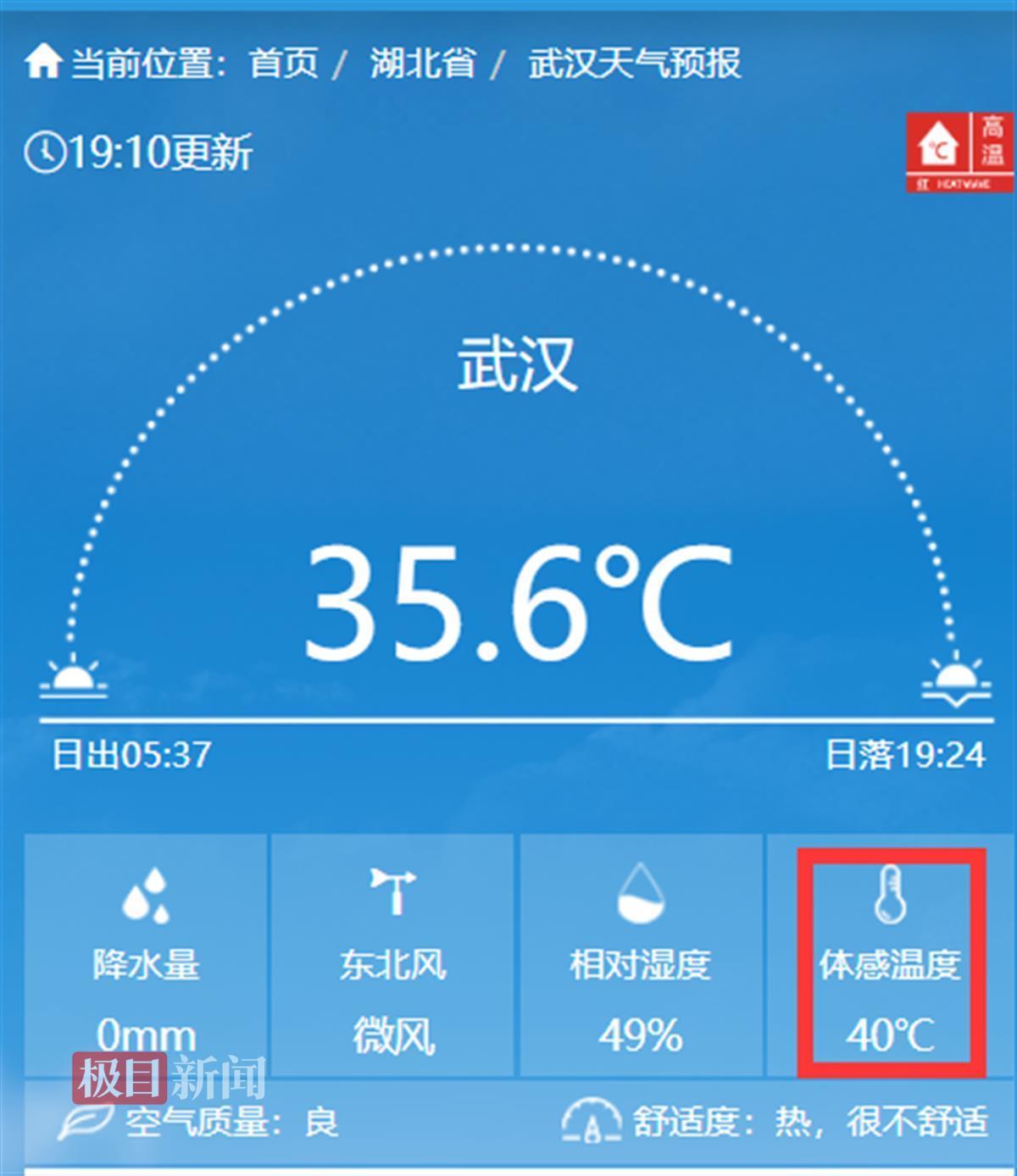 武汉19时气温35.6℃,体感温度40℃