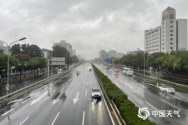 北京今晨降雨持续,路面湿滑。(图/中国天气网 王晓)