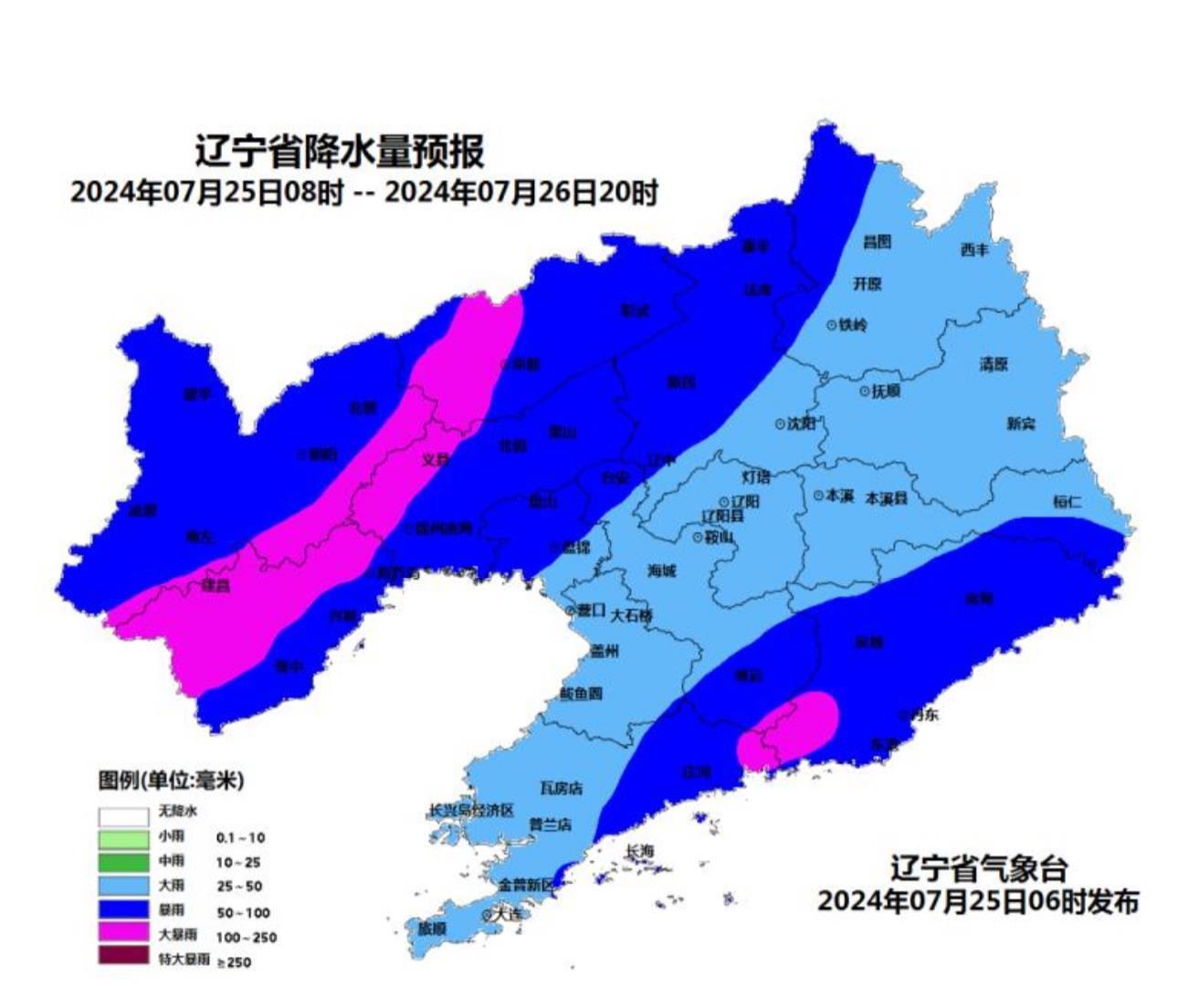 预计7月25日至26日白天,沈阳中北部、丹东、锦州、阜新、朝阳、葫芦岛地区及庄河、长海,台安、岫岩,桓仁,盘山有暴雨到大暴雨(50~250毫米),个别乡镇(街道)有特大暴雨(250~300毫米),其他地区有大雨(25~50毫米),局部暴雨(50~100毫米);上述地区伴有短时强降水、雷电、大风等强对流天气,最大小时降雨量40~80毫米,个别乡镇(街道)可达80毫米以上,最大风力8~10级,个别乡镇(街道)10级以上。