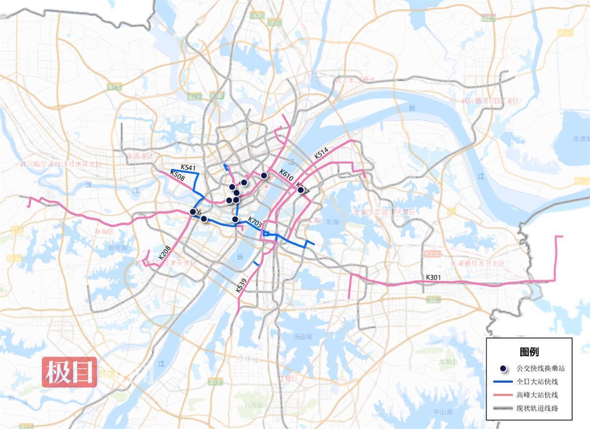 “上新”的10条大站快线为:K508路(由百步亭路幸福街经解放大道至解放大道同济医院)、K577路(由汉黄路岱家山经武汉大道至武昌火车站综合体)、K26路(由成功大道公交停车场经汉阳大道至阳新路公交停车场)、K208路(由博学路潮海村经东风大道至台北路天门墩)、K514路(由和平大道宜居路经和平大道至地铁积玉桥站)、K610路(由武汉火车站至汉口火车站)、K301路(由关山大道公交场站经高新大道至聚贤路仁慧路)、K539路(由黄家湖二街中医药大学经白沙洲大道、中山路至徐东大街岳家嘴)、K703路(由汉口火车站经青年路、武珞路至珞珈山路劝业场)、K541路(由长丰大道东风村场站经解放大道、江汉二桥、汉阳大道至鹦鹉大道地铁琴台站)。