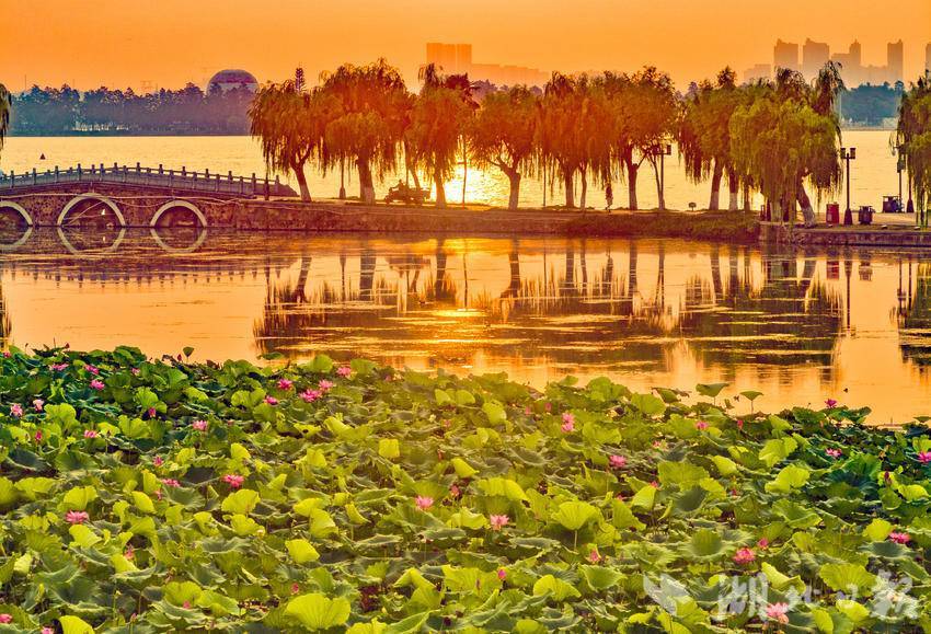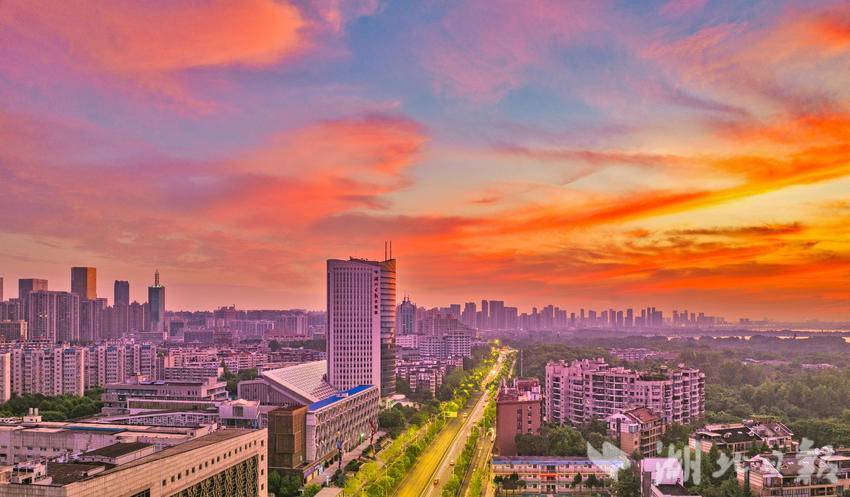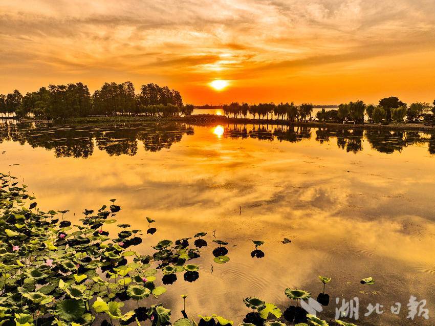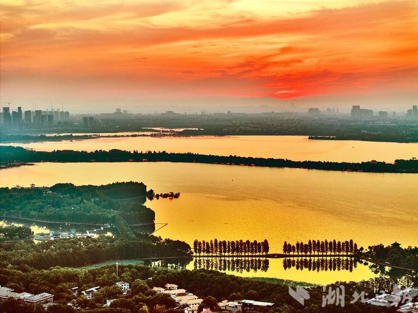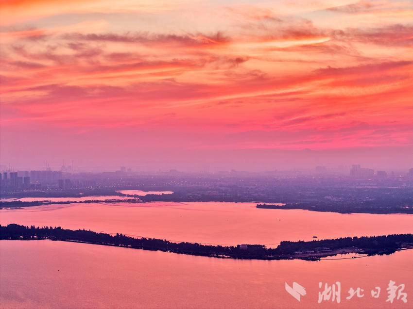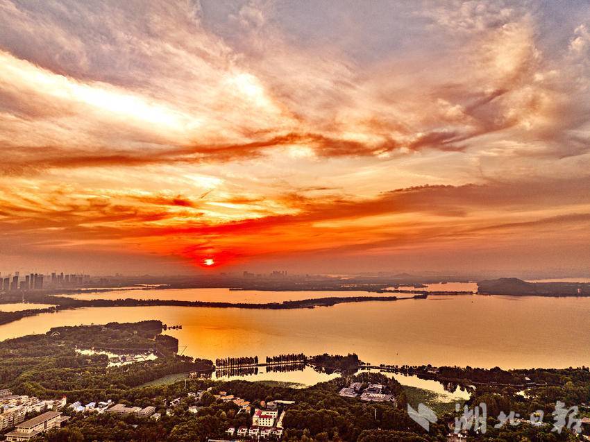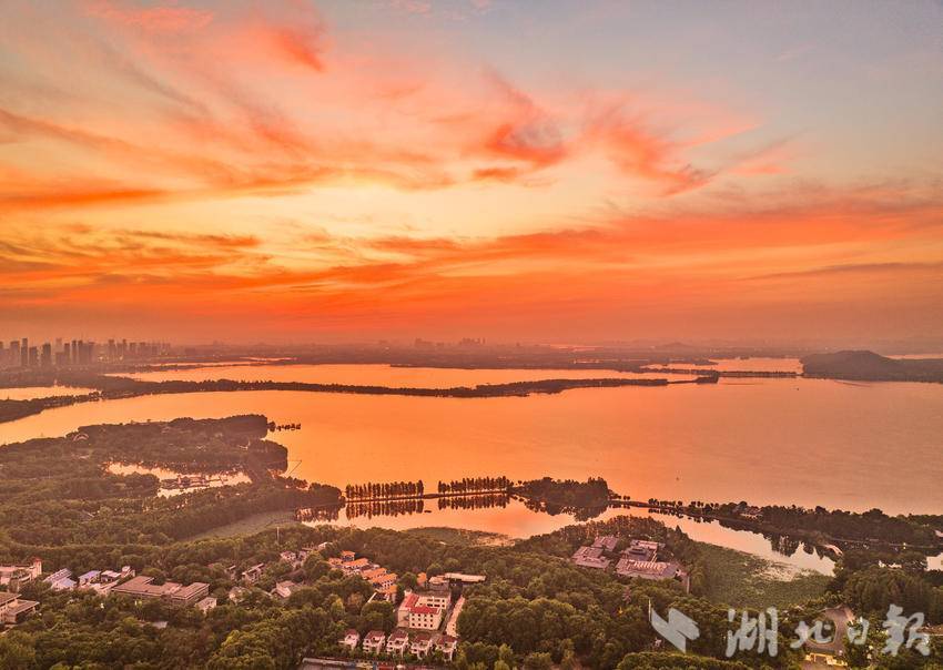 7月25日,清晨的武汉东湖景区朝霞漫天,美不胜收。武汉市民在色彩斑斓,如梦如幻的朝霞美景中,迎来了入伏后的又一个高温的“桑拿天”。当天6时33分,武汉中心气象台发布高温橙色预警,预计当天除神农架、恩施高海拔地区外,我省大部分地区最高气温将升至35℃以上,宜昌、武汉、黄冈、黄石、鄂州、咸宁最高气温将升至37℃以上。(湖北日报全媒记者 刘曙松 摄)