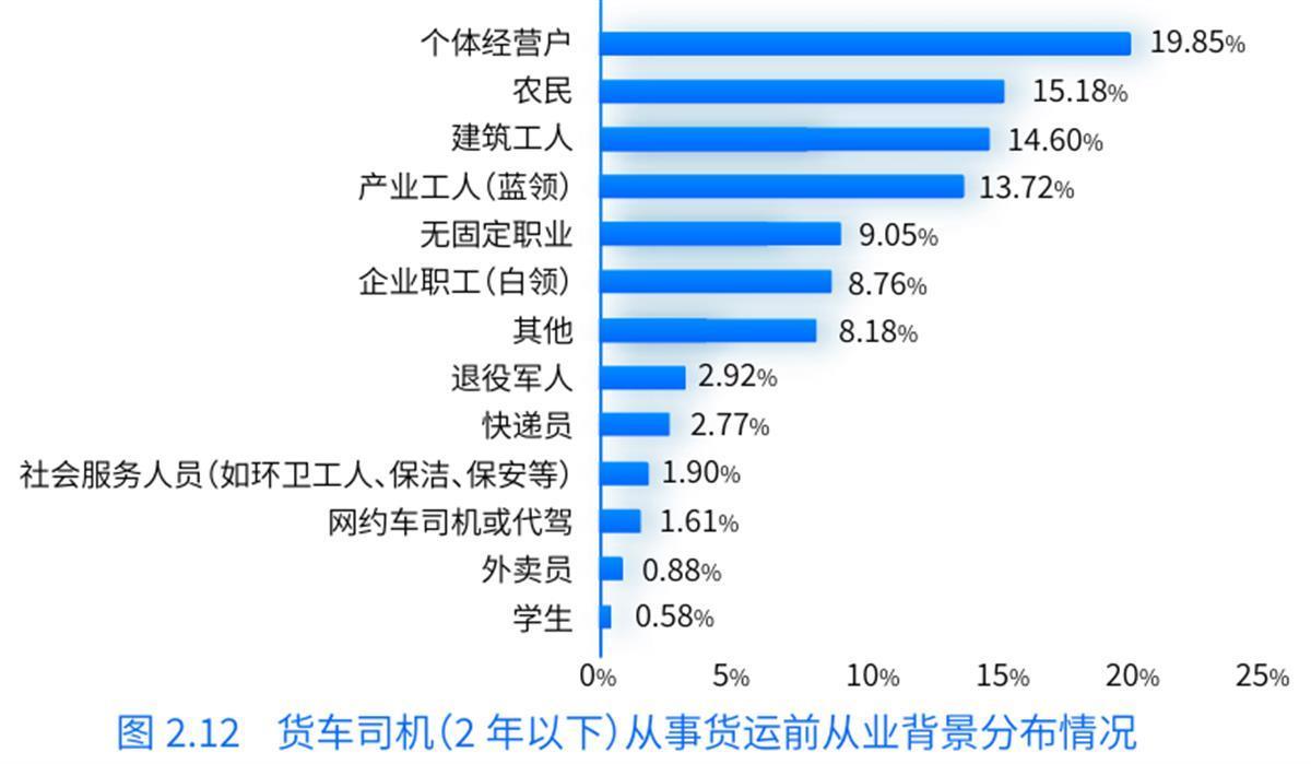 不仅如此,报告中还提到,过往货运行业对传统行业从业者的吸引力较强,多为农民、个体经营户、产业工人(蓝领)、无固定职业、建筑工人等群体。而近几年,转型从事货车司机的职业还包含了企业职工(白领)、社会服务人员、学生等,另外,外卖员、快递员、网约车司机及代驾司机等新型灵活就业者也有部分人群选择转行成为货车司机。