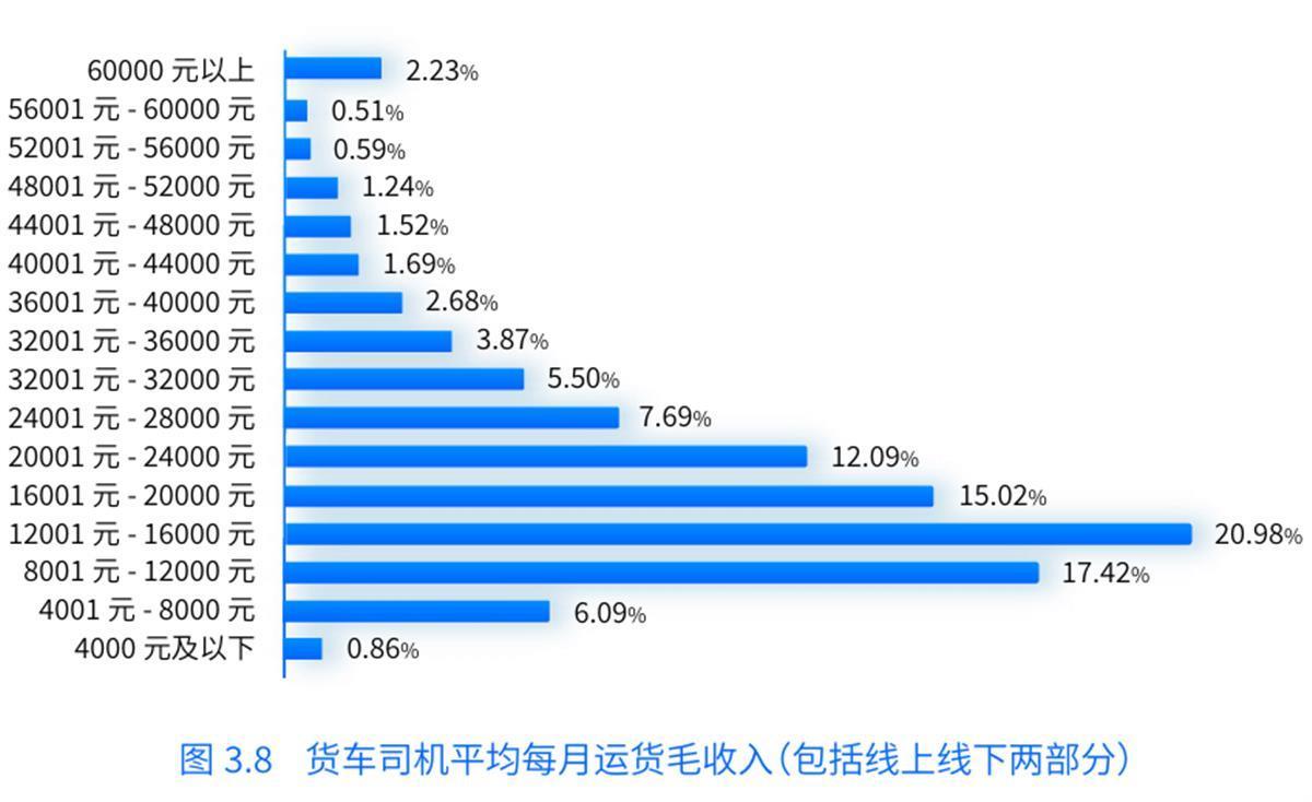 报告中提到,货车司机每月毛收入平均值为20441元。在剔除油(电、气)费、高速费、保险、保养和平台信息技术服务费等成本后,货车司机平均月净收入均值为12063元。
