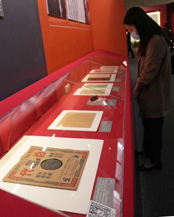 2022年9月29日,“光明摇篮 精神之源——迎二十大上海红色文物史料展”在上海市历史博物馆开幕。现场展示了首版《义勇军进行曲》黑胶唱片等展品。新华社记者 刘颖 摄
