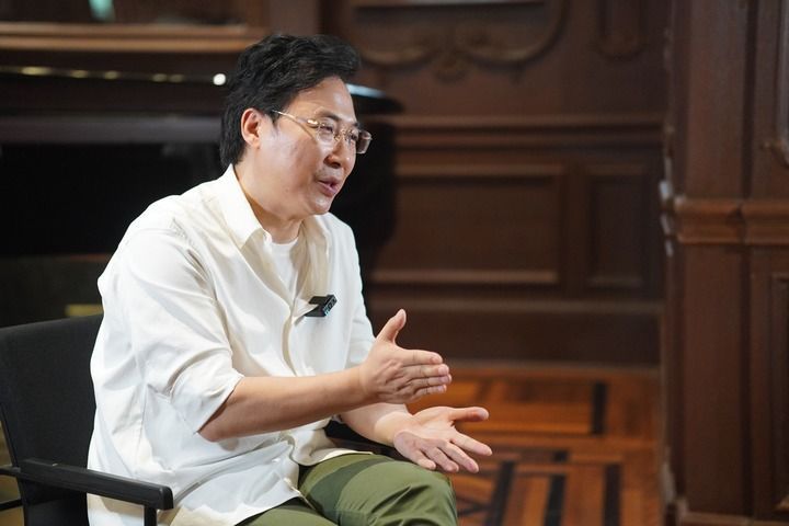 2024年7月9日,上海音乐学院院长、著名歌唱家廖昌永在校园内的上海城市音乐会客厅“镜厅”接受专访。新华社发 实习生田益铭摄影