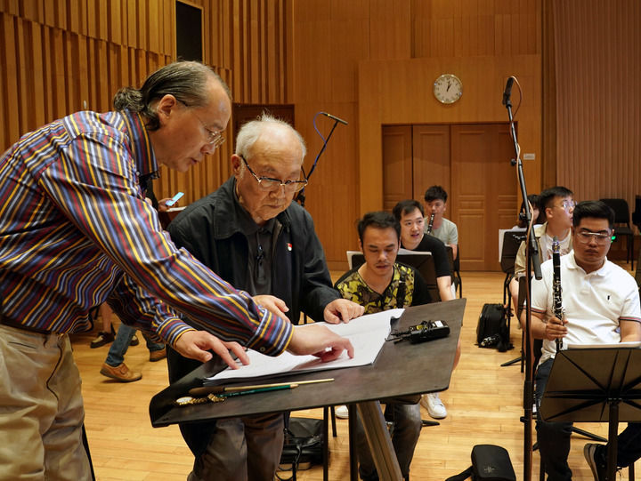 2021年6月9日,吕其明(左二)在上海爱乐乐团录制管乐版《红旗颂》的现场,与指挥林友声讨论乐谱。新华社记者 刘颖 摄