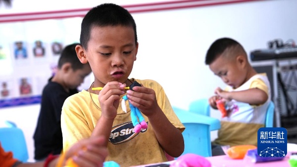 7月24日,在惠水县岗度镇龙泉村新时代文明实践站内,一名小孩正在玩橡皮泥。新华社记者郑明鸿 摄