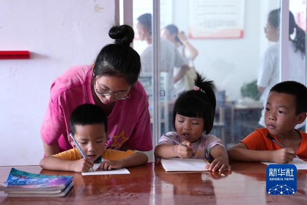 7月24日,在惠水县芦山镇朝阳社区新时代文明实践站内,天津工业大学风筝支教团成员正在指导小朋友练字。新华社记者郑明鸿 摄
