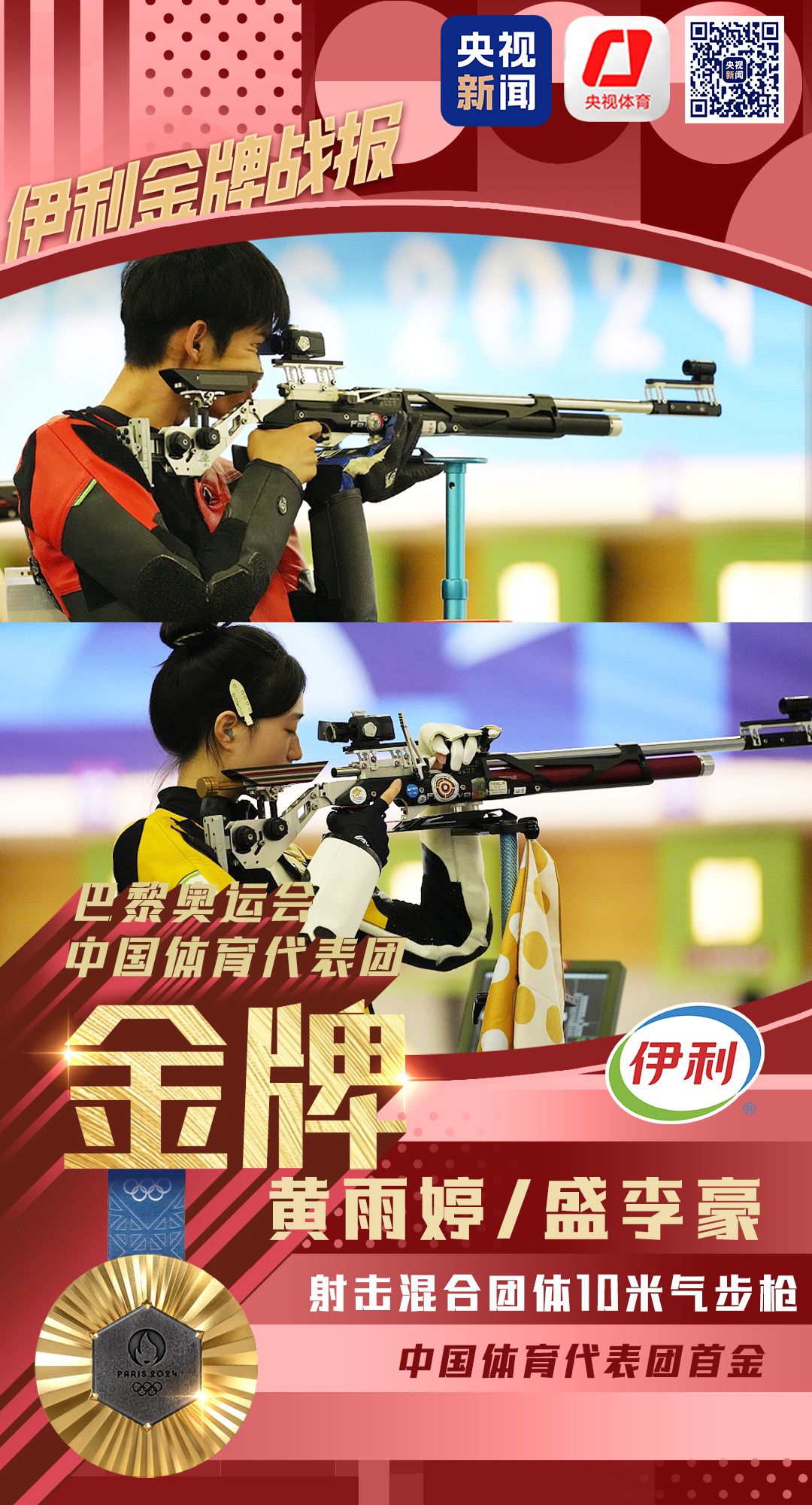 7月27日,在巴黎奥运会射击混合团体10米气步枪金牌赛中,中国组合黄雨婷/盛李豪夺得冠军。这是2024巴黎奥运会产生的首枚金牌,也是中国代表团在本届奥运会获得的首枚金牌。