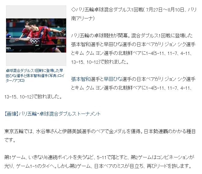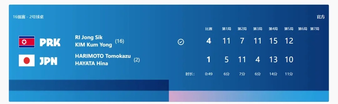 同时开球的另一场比赛中,赛会二号种子张本智和/早田希娜对阵朝鲜组合李正植/金琴英。最终日本组合1:4爆冷不敌对手,无缘混双八强,遭遇一轮游。