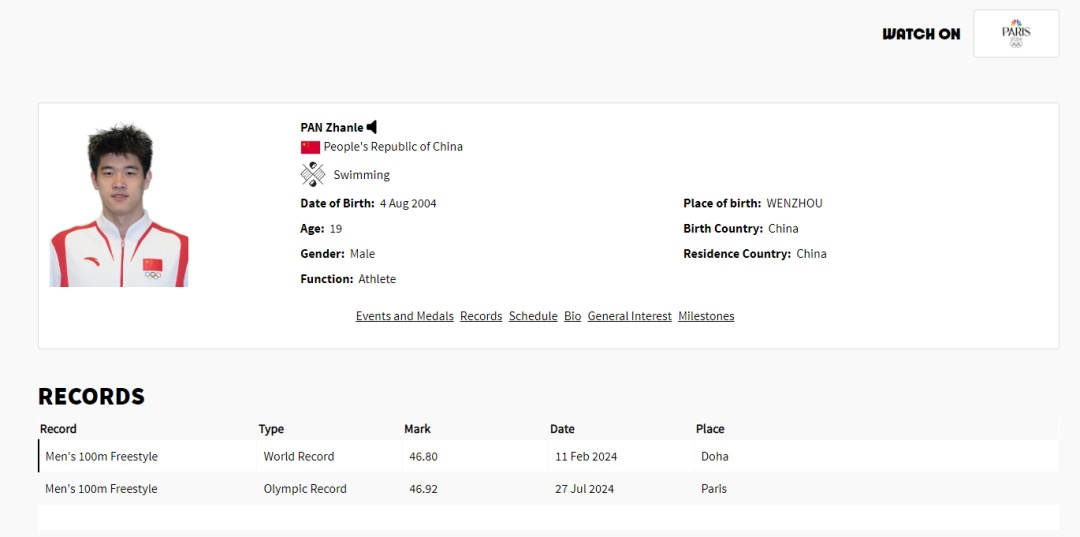 目前,巴黎奥运会选手资料卡已经更新:男子100米自由泳世界纪录与奥运纪录的保持者都是中国选手潘展乐。