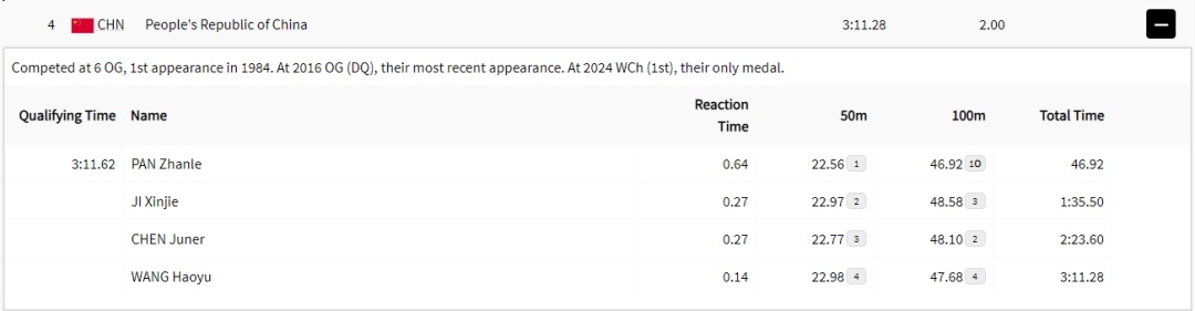 比赛中,第一棒出发的潘展乐出发反应时间出色,为0.64秒。此后,他很快占据领先身位。50米时,他以22秒56的成绩排名第一,并以46秒92的成绩触壁完成交接。