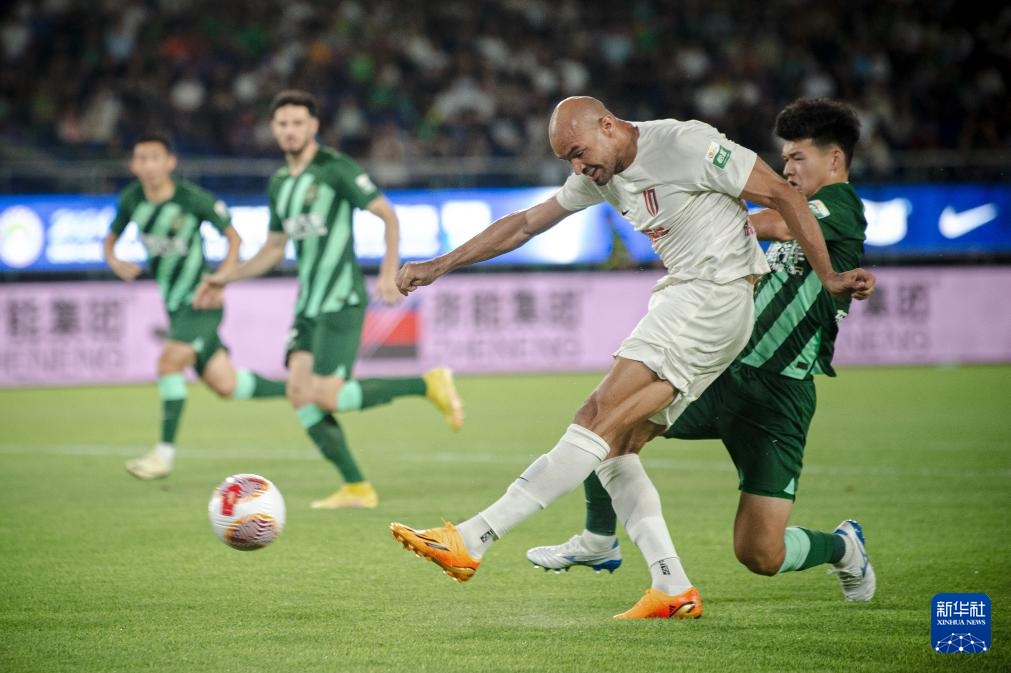 7月28日,成都蓉城队球员费利佩(前左)在比赛中射门。新华社记者 江汉 摄