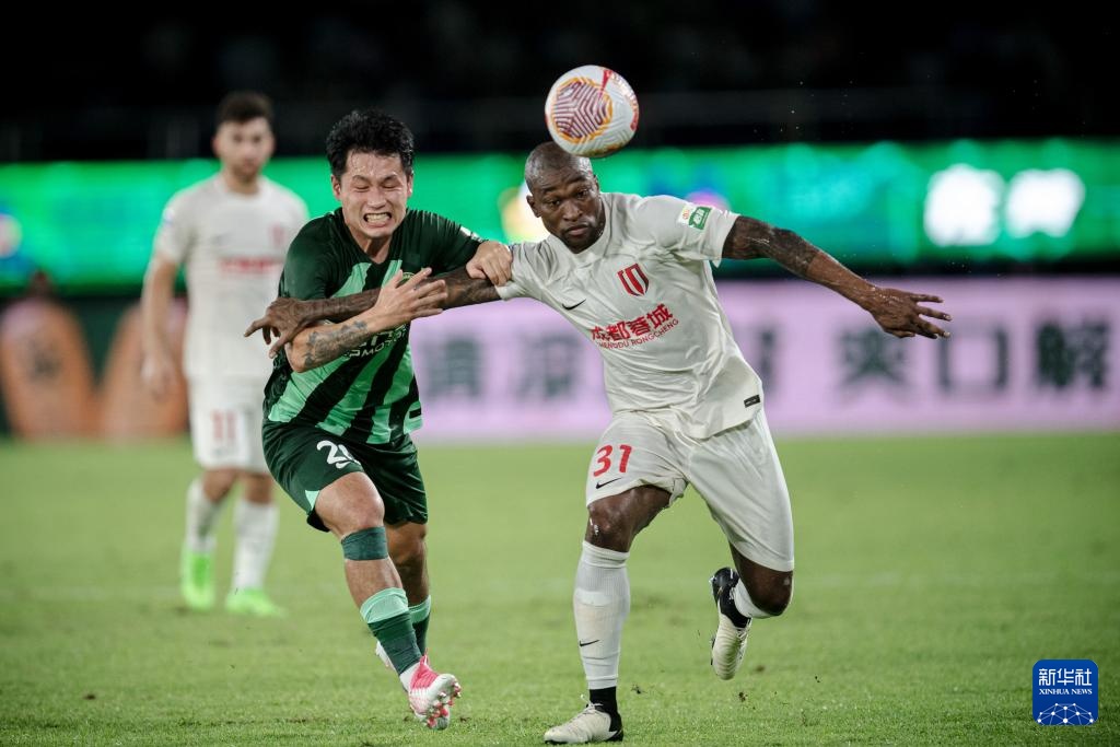 7月28日,成都蓉城队球员罗慕洛(上右)在比赛中头球攻门。新华社记者 江汉 摄