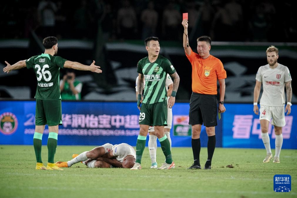 7月28日,主裁判甘树然(右二)向浙江队球员张佳祺(右三)出示红牌。新华社记者 江汉 摄