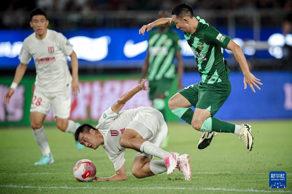 7月28日,成都蓉城队球员唐淼(下)在比赛中与浙江队球员孙国文拼抢。新华社记者 江汉 摄