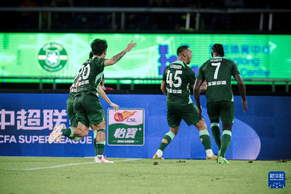 7月28日,浙江队球员莱昂纳多(右二)在比赛中庆祝进球。新华社记者 江汉 摄