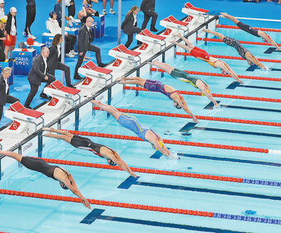 女子4×100米自由泳接力决赛,中国队选手杨浚瑄(右三)在比赛中。 本报记者 雷 声摄 |