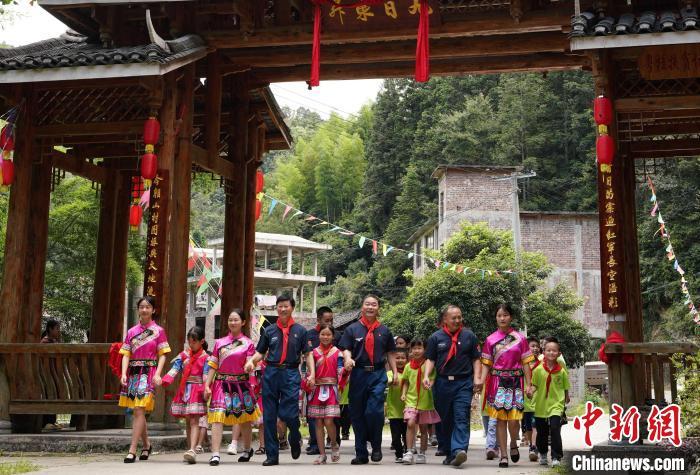 近日,广西桂林市龙胜各族自治县马堤乡东升村,学生在寨门口迎接“老战士乡村振兴服务队”的退役老兵。杨宗盛 摄