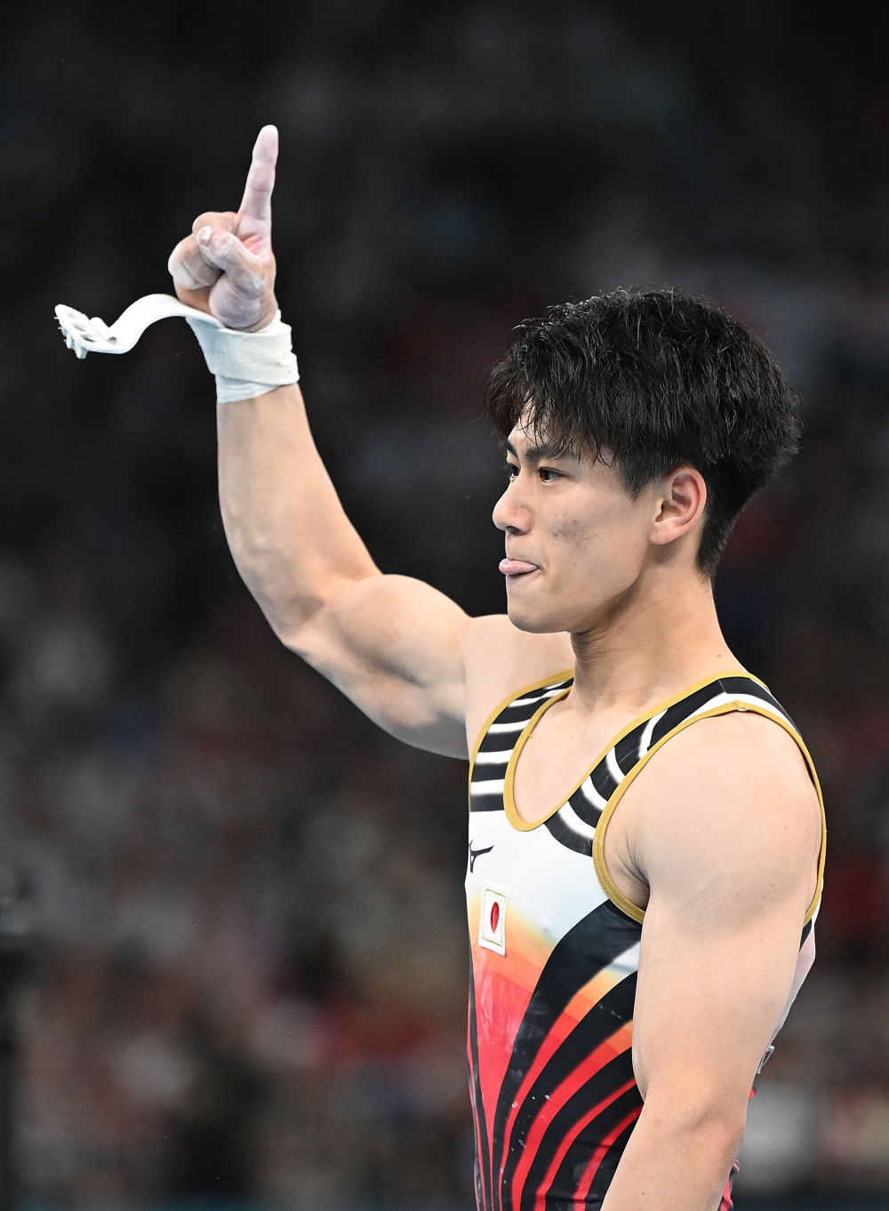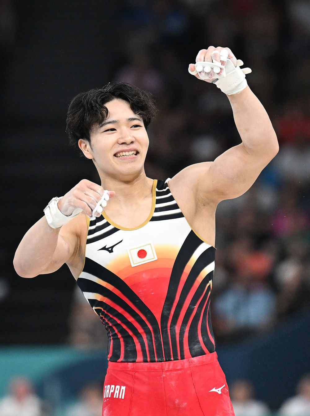 ↑日本队选手杉野正尧在鞍马比赛后庆祝。新华社记者 刘大伟 摄