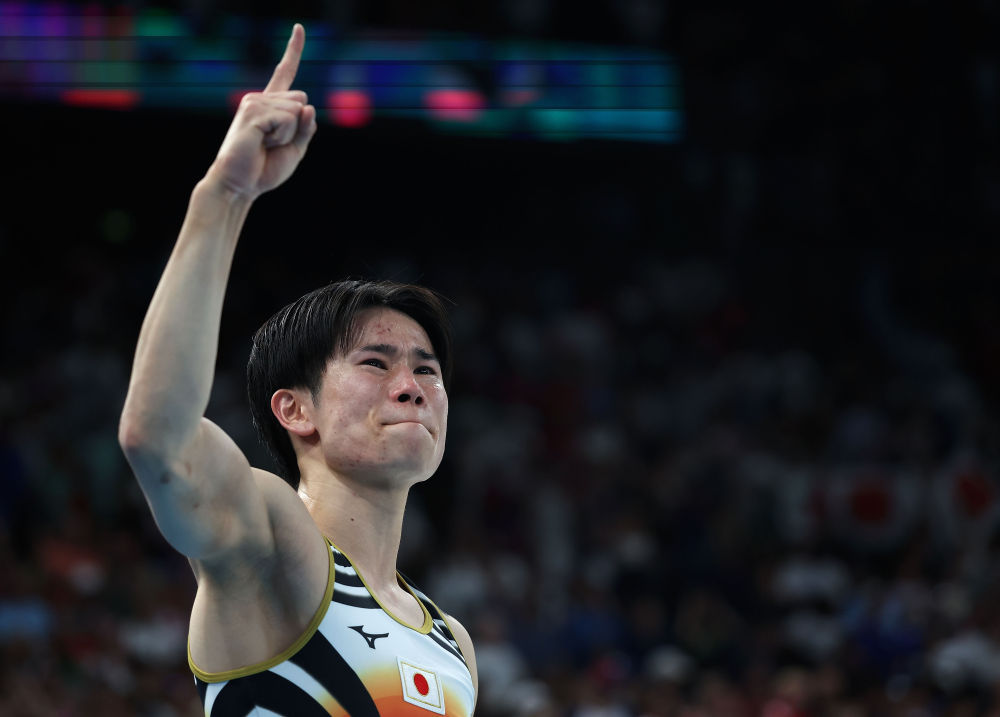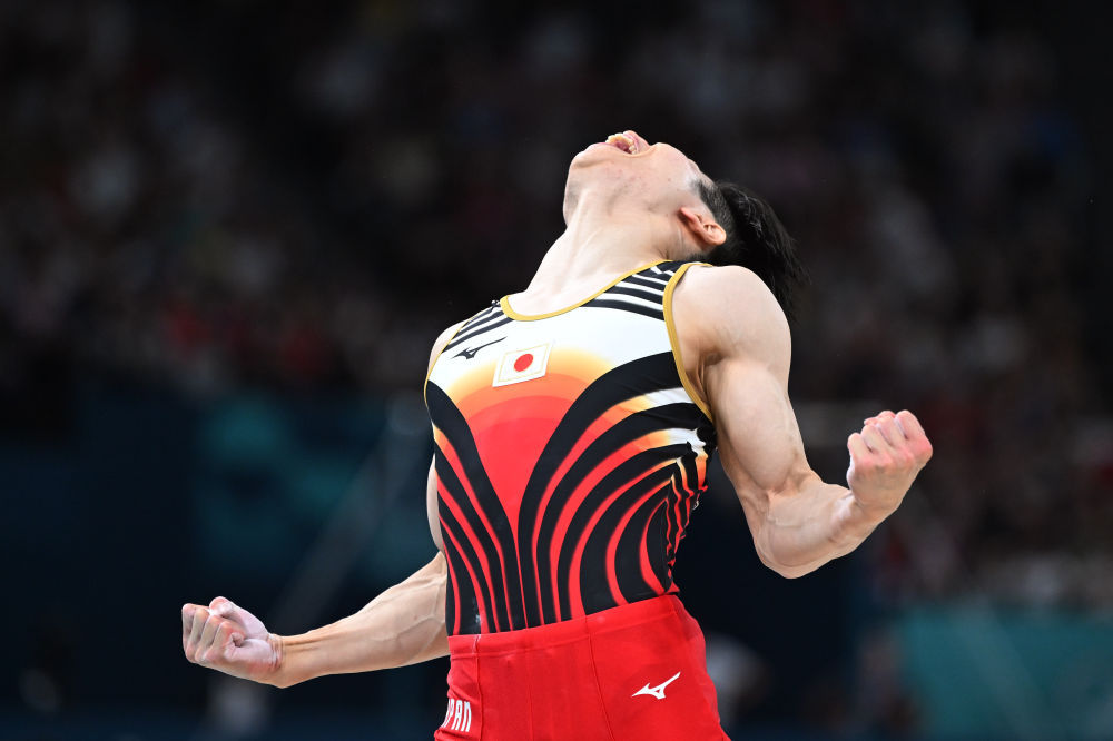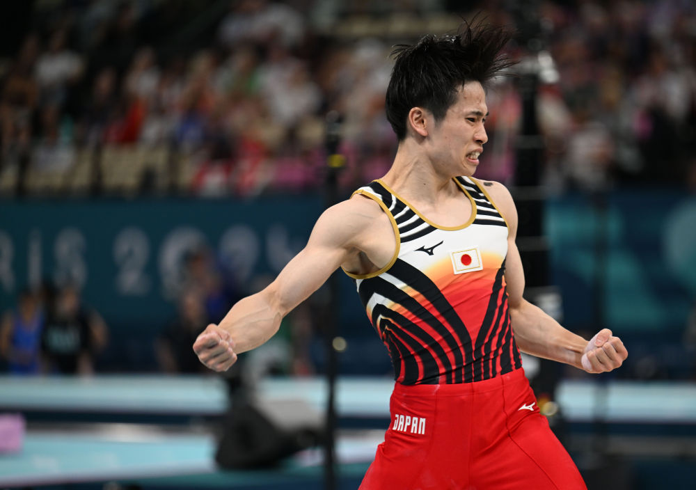 ↑日本队选手萱和磨在鞍马比赛后庆祝。新华社记者 程敏 摄