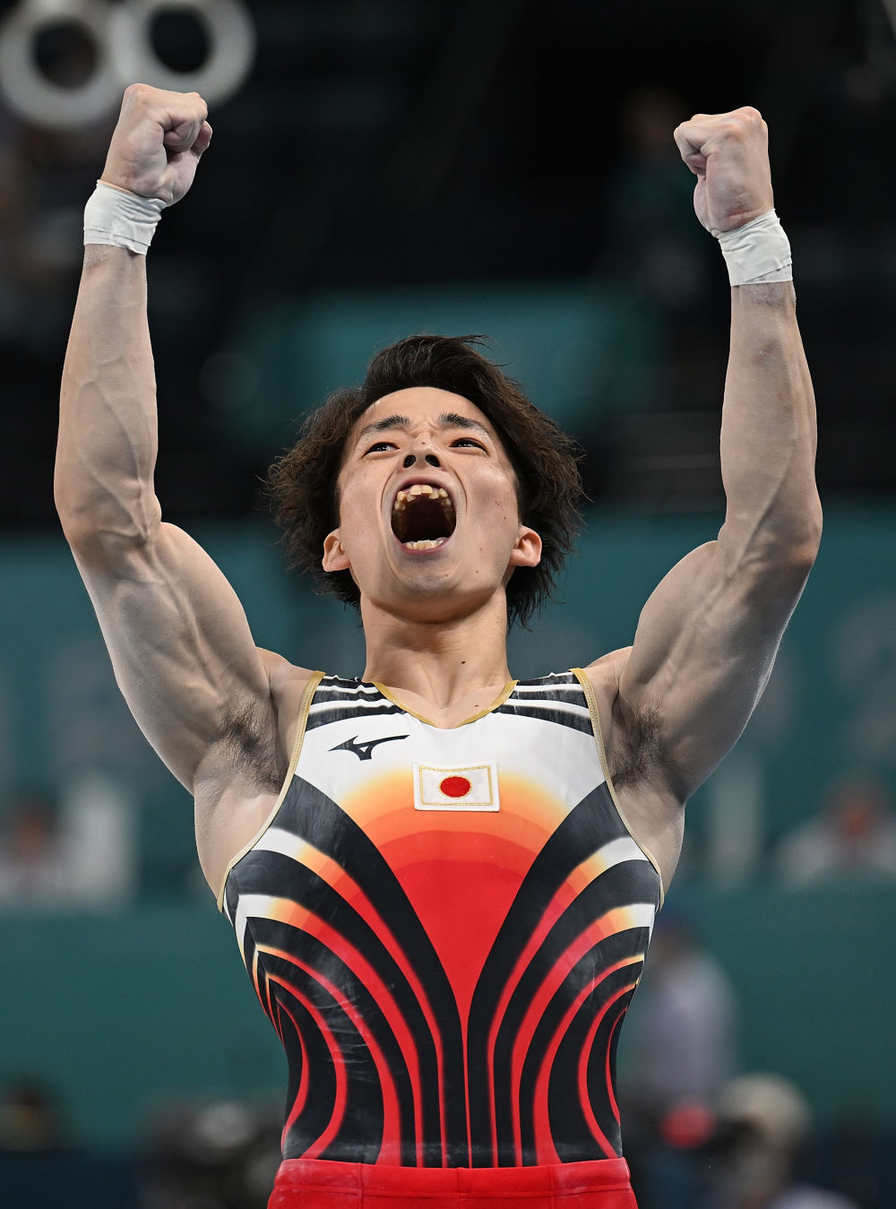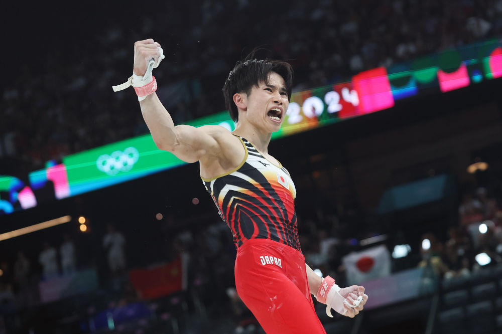 ↑日本队选手萱和磨在吊环比赛后庆祝。新华社记者 曹灿 摄