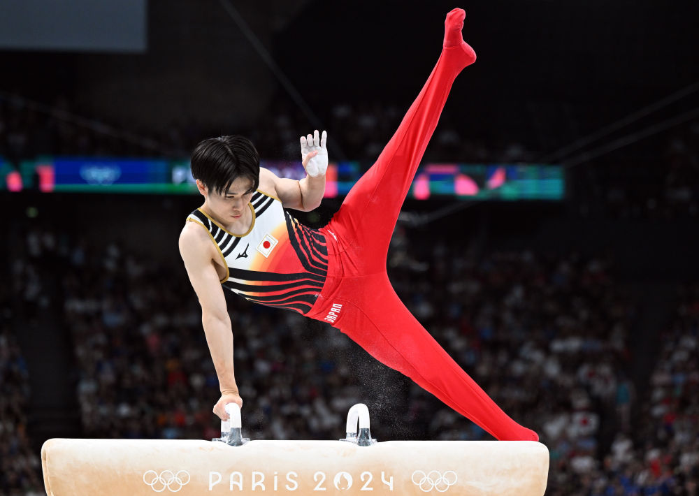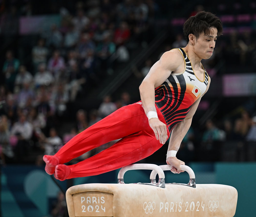 ↑日本队选手萱和磨在鞍马比赛中。新华社记者 程敏 摄