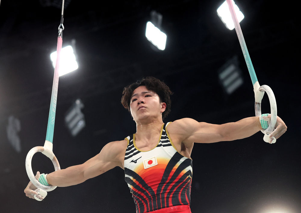 ↑日本队选手冈慎之助在吊环比赛中。新华社记者 曹灿 摄