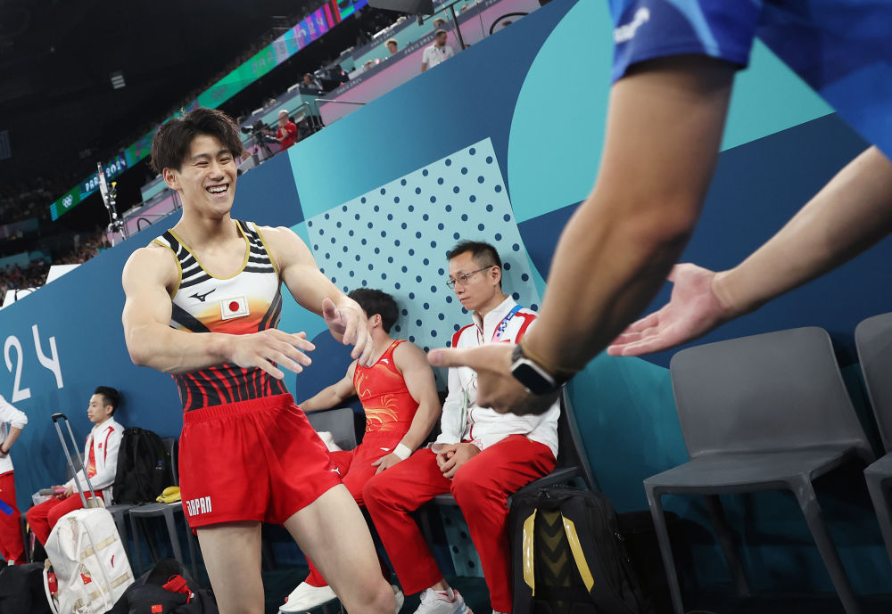 ↑日本队选手桥本大辉(右)在单杠比赛后与队友萱和磨庆祝。新华社记者 程敏 摄