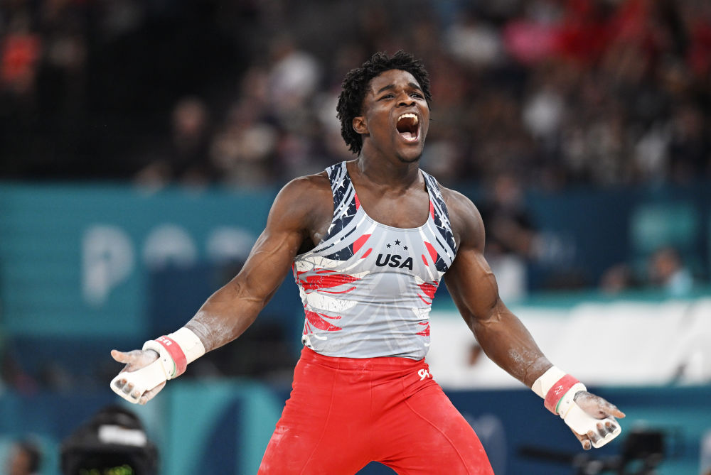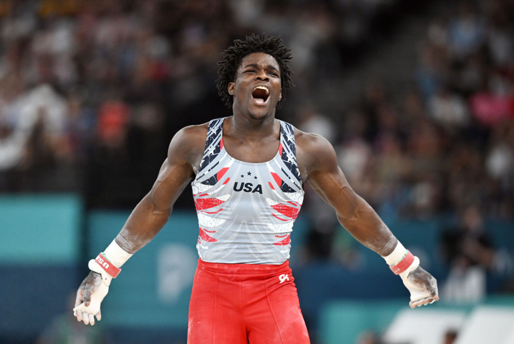 ↑美国队选手理查德在单杠比赛后庆祝。新华社记者 程敏 摄