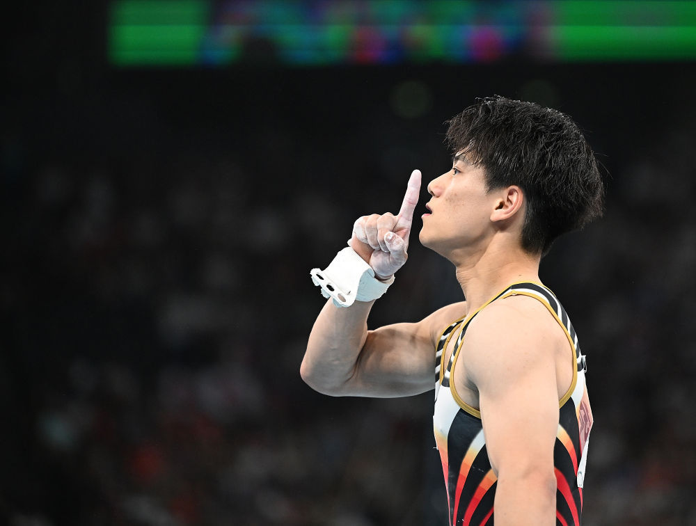 ↑日本队选手冈慎之助在单杠比赛后庆祝。新华社记者 刘大伟 摄