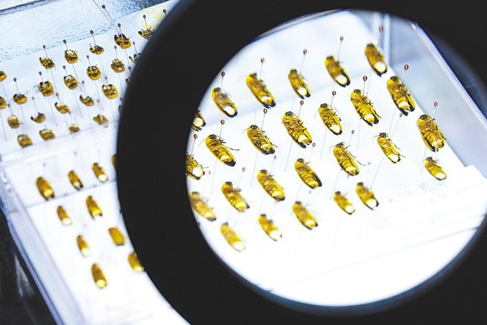 6月4日,华中农业大学发光昆虫及行为实验室内,付新华在观察萤火虫标本。