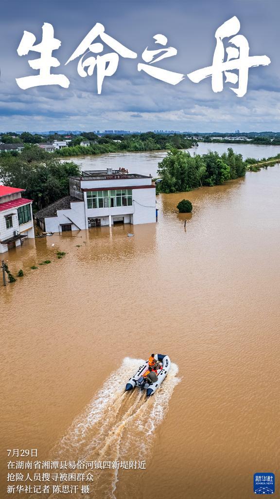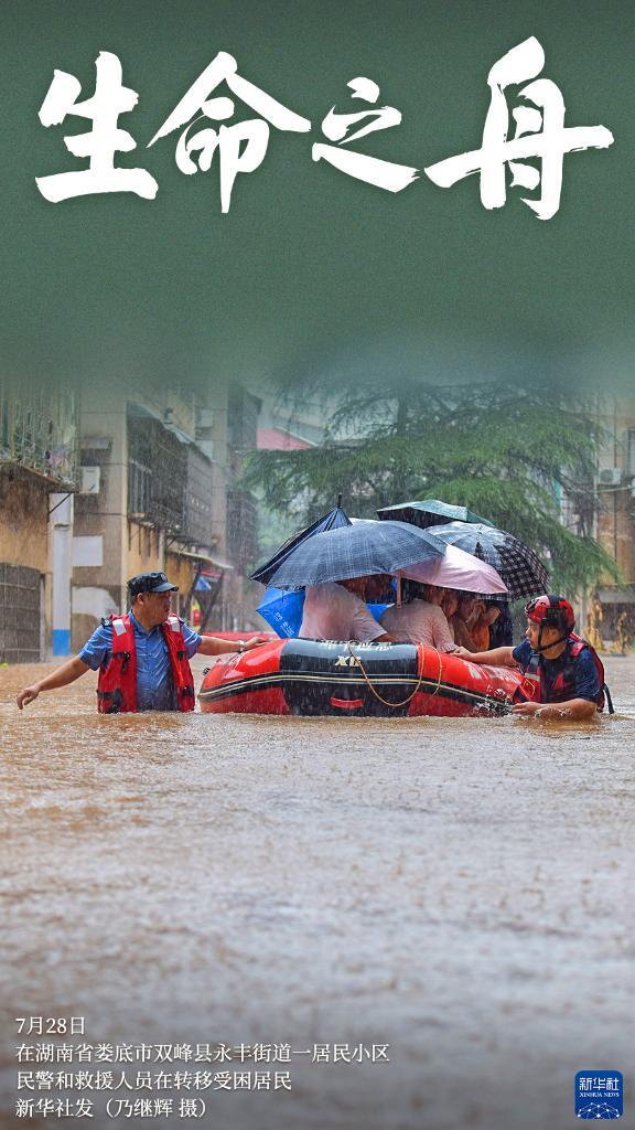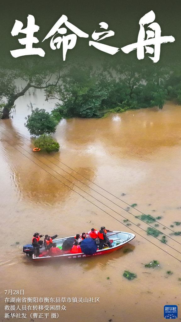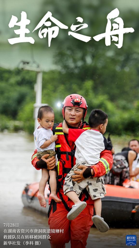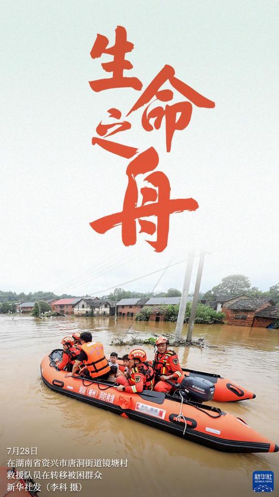 洪水中,救援人员带着坚定的信念和无畏的勇气,乘“生命之舟”驶向等待救援的受困群众,描绘出一幅幅感人至深的救援画卷。