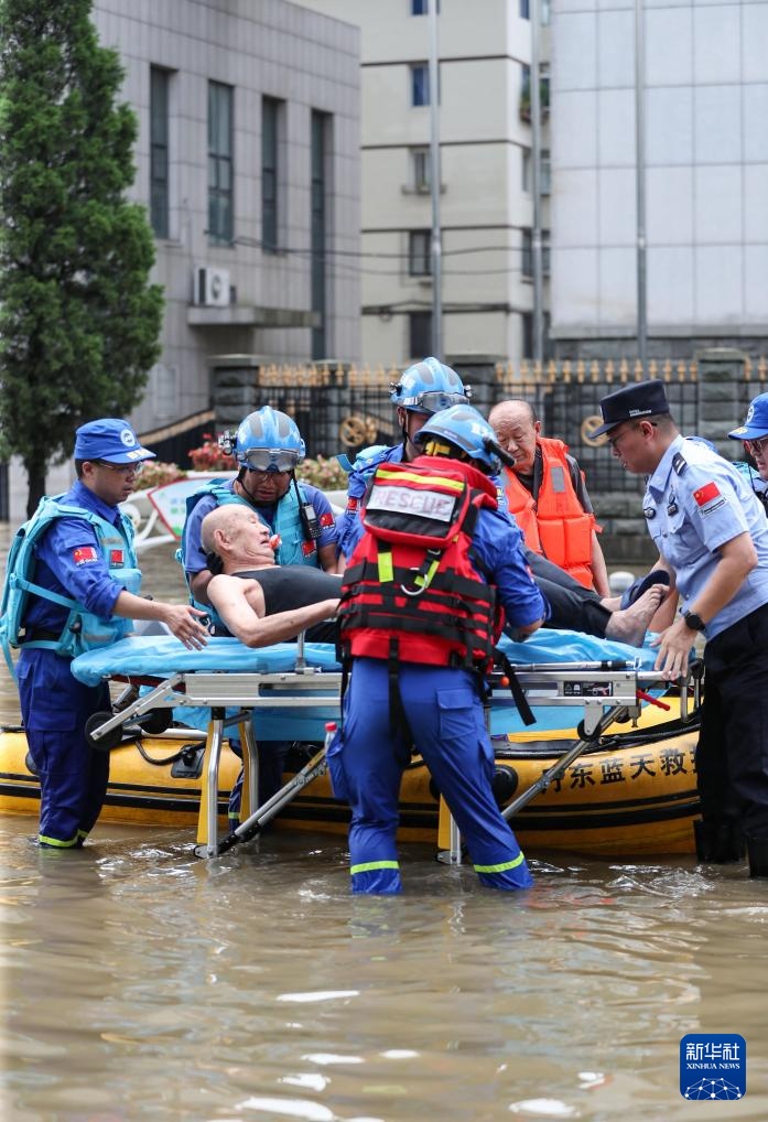 7月30日,在丹东市十纬路口岸坝门,丹东边境管理支队一经街边境派出所所长厍世博(右一)和救援人员将受困群众转移至安全区域。新华社记者龙雷摄