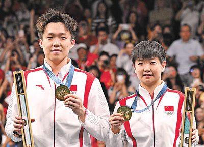 当地时间7月30日,王楚钦(左)/孙颖莎在颁奖仪式上。 本报记者 雷 声摄 |