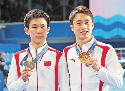 当地时间7月29日,练俊杰(右)/杨昊在展示金牌。 本报记者 厉衍飞摄 |